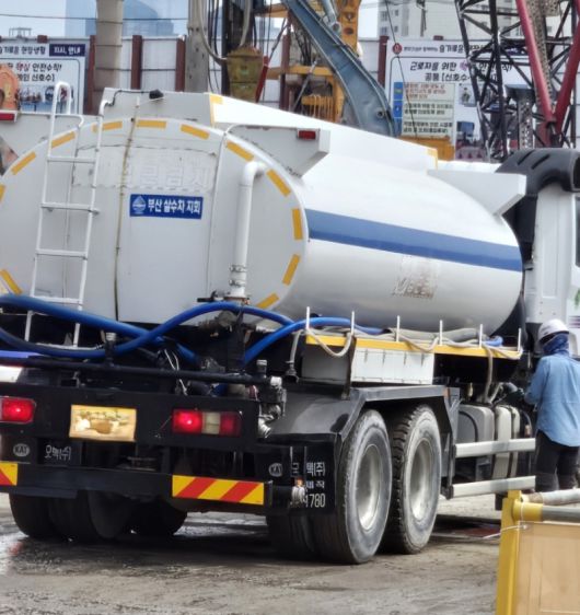 중견건설사 C사의 부산재송동 토목 공사현장에서 살수차가 직접 주유를 받고있는 불법현장. 사진 = 손상훈기자 |