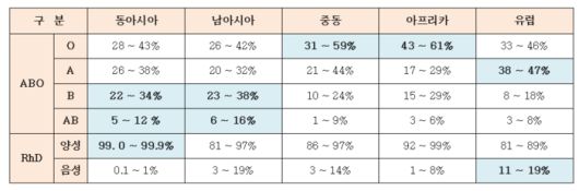 교수팀에 따르면 한국, 일본, 중국, 대만 등의 동아시아는 유럽, 중동, 아프리카 지역과 달리 AB형의 비율이 상대적으로 높은 반면 RhD 음성은 극히 낮은 것으로 나타났다. 구체적으로는 동아시아에서 AB형의 분포는 5~12%, RhD 음성 분포는 0.1~ 1%로 나왔고, 유럽에서는 각각 3~8%, 11~19%로 집계됐다. 혈액형 분포에서 지역적, 인종적 차이가 뚜렷하게 드러난 것이다.