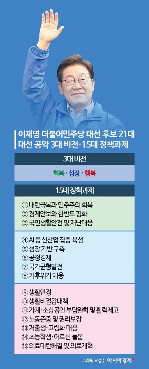 이재명 더불어민주당 대선 후보의 제21대 대통령선거 정책 공약집에는 20대 대선에서 눈에 띄었던 '기본' 시리즈가 빠지고 인공지능(AI)을 주축으로 한 성장이 강조됐다. 12·3 비상계엄이 이번 6·3 대선이 치러지는 중요한 원인인 만큼 이를 부각하는 '민주주의'도 공약집에 중점적으로 제시됐다.