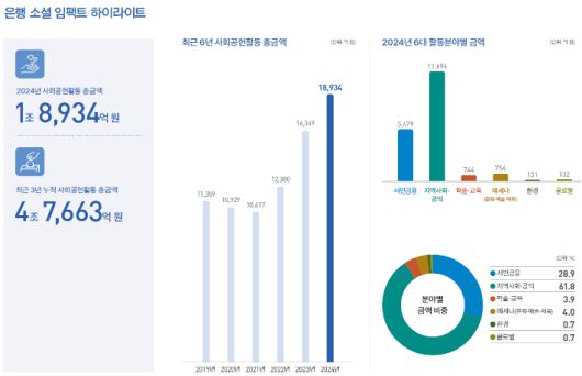 은행연합회가 28일 밝힌 '2024 은행 사회공헌활동 보고서'를 보면 지난해 은행권이 사회공헌활동에 쓴 금액은 총 1조8934억원으로 전년(1조6349억원)보다 15.8% 늘었다.