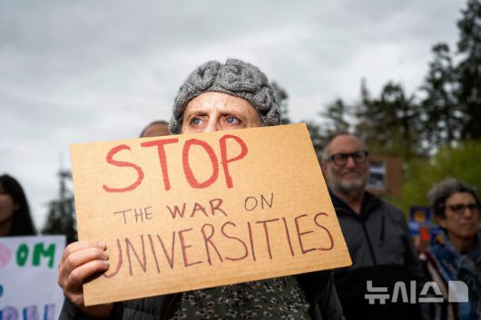 [버클리=AP/뉴시스] 지난달 17일(현지 시간) 미국 캘리포니아주 버클리에서 열린 '고등교육을 위한 행동의 날(Day of Action for Higher Ed)' 시위에 참여한 시민. 2025.05.29.
