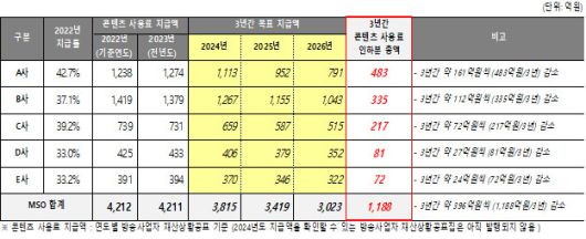 특히, 한국방송채널진흥협회가 KCTA 측에서 제시한 기준안을 기반으로 콘텐츠 사용료를 앞서 계산해 본 결과<사진> 5개 MSO 사업자들은 모두 ‘보정옵션’ 적용 대상이 되고 3년간 약 1200억원 규모 콘텐츠사용료가 감액될 수도 있어 PP 업계의 우려가 크다는 설명이다.