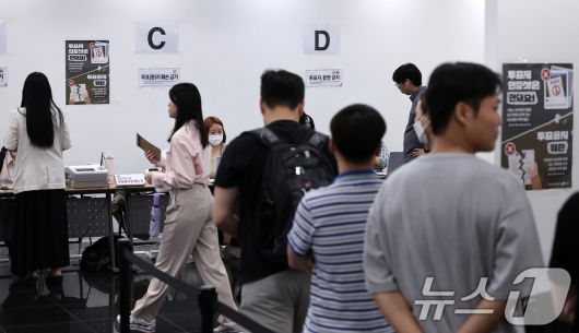 제21대 대통령 선거 사전 투표 첫날인 29일 오전 서울 강남구 역삼1동 주민센터에 마련된 사전투표소에서 유권자들이 투표하기 위해 줄을 서 있다. 2025.5.29/뉴스1 ⓒ News1 김성진 기자 |