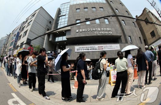 (서울=뉴스1) 이동해 기자 = 제21대 대통령선거 사전투표 첫 날인 29일 서울 종로구 종로1·2·3·4가동 주민센터 투표소에 마련된 투표소에서 직장인들이 점심시간을 이용해 투표를 위해 길게 줄을 늘어서 있다. 사전투표 첫날 오후 1시 기준 전국 평균 투표율은 지난 20대 대선(36.93%)의 같은 시각 투표율(8.75%)보다 1.76% 높은 10.51%로 역대 최고치다. 2025.5.29/뉴스1