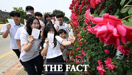 [더팩트ㅣ수원=임영무 기자] 제21대 대통령 선거 사전투표 첫날인 29일 오후 경기 수원시 장안구 연무동 행정복지센터 사전투표소에서 생애 첫 대통령 선거에 참여한 수원 삼일공업고등학교 학생들이 장미 넝쿨 앞에서 투표 기념사진을 찍고 있다.