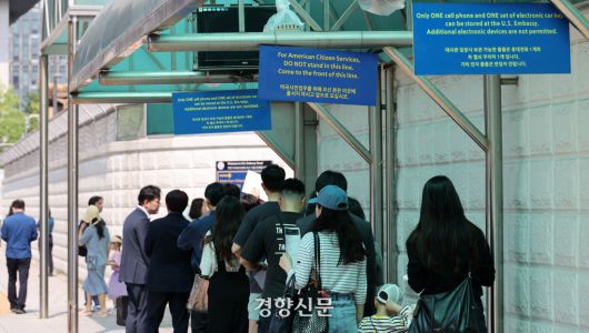 시민들이 29일 서울 종로구 주한미국대사관 앞에 비자 발급을 위해 줄을 서서 순서를 기다리고 있다. 김창길 기자 |
