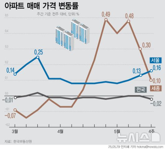 서울(0.13%→0.16%)은 상승폭이 한층 더 커졌다. 서울 매매가격은 5월 들어 5일 0.08%→12일 0.1%→19일 0.13%→26일 0.16%로 3주 연속 상승폭이 확대됐다. 올해 들어 서울의 매매가격은 1.83% 상승했다.