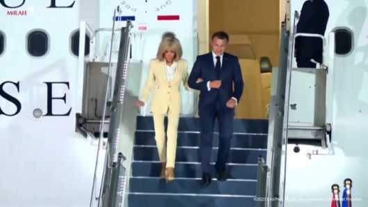 마크롱 대통령은 자신을 맞이하러 나온 인사들에게 손을 흔든 뒤 브리지트 여사에게 오른팔을 내밀었다. 브리지트 여사는 팔짱을 끼며 비행기에서 내리는 등 다정한 부부 사이를 보였다.