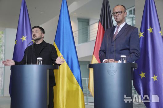 [베를린=AP/뉴시스] 볼로디미르 젤렌스키(왼쪽) 우크라이나 대통령과 프리드리히 메르츠 독일 총리가 28일(현지 시간) 베를린 총리실에서 공동 기자회견하고 있다. 메르츠 총리는 우크라이나의 장거리미사일 자체 생산을 돕겠다고 밝혔다. 2025.05.29.