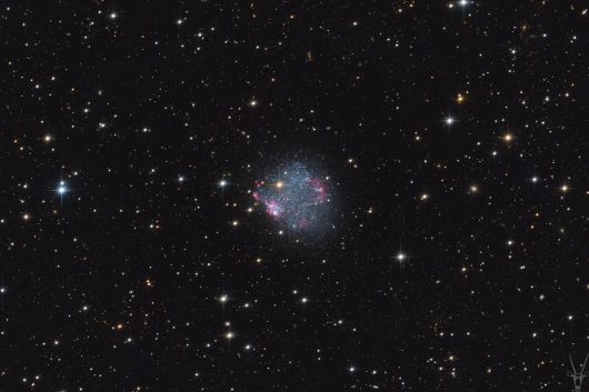 화려한 대형 나선 은하처럼 작은 은하들도 별을 만든다. 사진 속의 왜소불규칙은하 ‘육분의 A’에서도 밝고 푸른 젊은 별 무리와 별이 새로 태어나는 분홍빛 구역들을 볼 수 있다. 왜소불규칙은하는 나선 은하, 타원 은하와 달리 뚜렷한 형태를 갖지 않으면서 질량이 작은 은하다. 사진에서 보이는 밝고 노란색을 띠는 별들은 우리은하에 있는 별들이다.