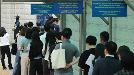 미국 당국이 미국에 유학하려는 학생에 대해 소셜미디어(SNS) 심사를 의무화하는 방안을 검토하고 있다고 미 정치전문매체 폴리티코가 관련 외교 전문을 입수해 보도했다. 또 미 국무부는 이 같은 제도 도입을 준비하기 위해 전 세계 외교 공관에 유학생 비자 인터뷰를 일시 중단할 것을 지시했다고 이 매체는 전했다. 사진은 28일 서울 종로구 주한 미국대사관 앞에서 미국 비자를 발급받으려는 사람들이 줄을 서 있는 모습./연합뉴스 |