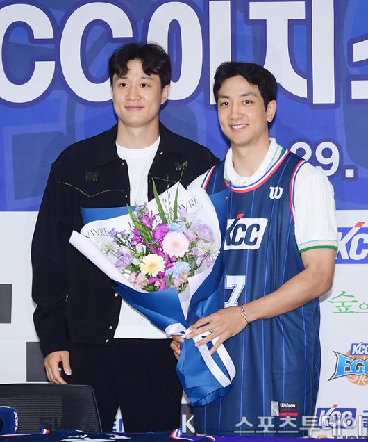 [스포츠투데이 권광일 기자] KCC 허훈이 29일 오후 서울 강남구 KBL센터에서 열린 부산KCC 이지스 입단식에 참석해 허웅과 기념촬영을 하고 있다. 허훈은 계약기간 5년, 총 보수 8억 원(연봉 6억 5000만원, 인센티브 1억 5000만원) 조건으로 부산KCC 이지스와 계약을 체결했다. 2025.05.29. [스포츠투데이 권광일 기자 sports@stoo.com]