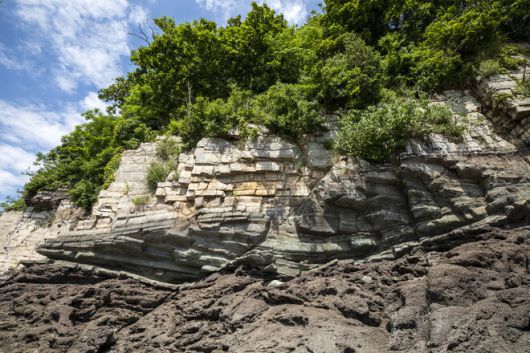 약 1억 년 전 중생대 백악기, 공룡이 거닐던 시절 화산재가 퇴적돼 굳어진 경기도 화성시 전곡항 일대 층상응회암. 화성시 제공 |