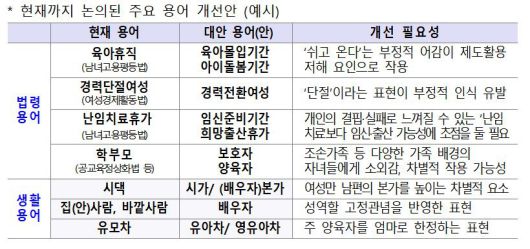 저출산고령사회위원회는 29일 정부서울청사에서 제13차 인구비상대책회의를 열고 이같이 밝혔다. 그동안 육아 휴직, 경력단절 여성 등 일부 용어가 직장 내 눈치 문화 등으로 제도의 긍정적 취지를 제한하거나 부정적 인식, 편견을 조장할 수 있다는 문제 제기가 있었다. 이에 정부는 올해 3월 용어정비 추진 방안 발표 이후 관계부처, 연구기관, 산하기관 등을 중심으로 각계 의견수렴과 광범위한 법령에 대한 포괄적 검토를 진행했다. 또한 법령용어뿐만 아니라 일상생활에서 사용되는 용어까지 포함해 개선이 필요한 용어를 발굴하고 대안을 검토하고 있다.