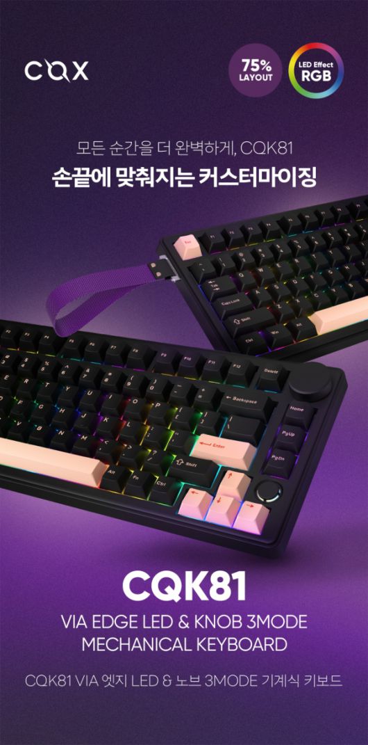 [디지털포스트(PC사랑)=남지율 기자] 삶의 새로운 패러다임, '뉴 라이프 플랫폼'을 만들어가는 주식회사 앱코(대표이사: 오광근)의 게이밍 기어 브랜드 '콕스(COX)'가 다채로운 사용자 니즈를 고려한 기계식 키보드 '콕스 CQK81 VIA 엣지 LED & 노브 3MODE 기계식 키보드(이하: CQK81)'를 정식 출시했다.