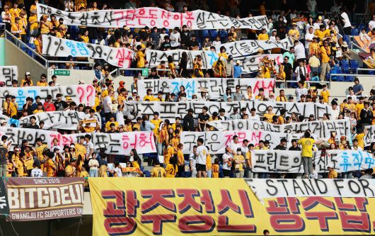 지난 25일 프로축구 광주FC 서포터스가 강원과 벌인 홈 경기에서 구단의 부실 행정을 비판하는 걸개를 펼쳐보이고 있다. /연합뉴스 |