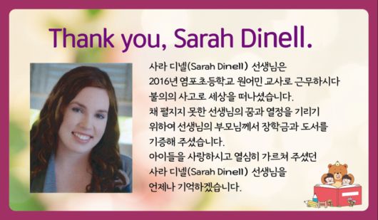 디넬의 부모는 학생 영어 교육을 지원하기 위해 학교에 영어 도서 295권도 기증했다. 염포초는 이를 기리기 위해 교내 도서관에 ‘사라 디넬 서가’를 마련했다.