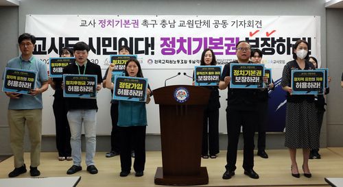 (홍성=연합뉴스) 한종구 기자 = 충남교사노동조합, 전국교직원노동조합 충남지부, 충남좋은교사운동 등 충남지역 5개 교원 단체는 29일 "교사의 정치기본권을 보장하고 정당 가입을 허용해야 한다"고 촉구했다.