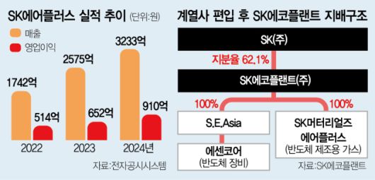 SK에코플랜트는 건설사에서 폐기물 처리 등 환경사업을 확장하면서 최대 10조원 규모로 상장을 추진했으나 업황 부진으로 환경사업을 사실상 철수하고 안정적인 반도체 관련 계열사를 편입시켰다. SK에어플러스는 울산을 본점으로 반도체, 석유화학 공정의 필수재인 질소와 산소, 아르곤을 제조 공급하고 있다. 2023년 SK머티리얼즈리뉴텍을 흡수합병해 초고순도 탄산가스의 생산 역량을 확보했다. 매출액은 2021년 1643억원에서 2024년 3233억 원으로 급증했고, 같은 기간 영업이익은 538억 원에서 910억 원으로 상승했다. 자산 규모는 8928억 원에서 7299억 원으로 감소했다.
