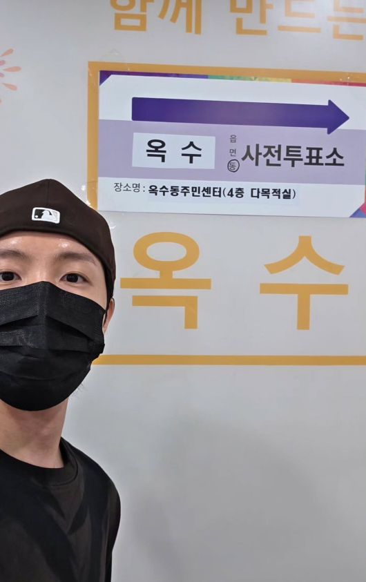 '방탄소년단' 제이홉은 인스타그램에 사전투표소를 배경으로 찍은 셀카를 올렸다. 모자, 마스크, 티셔츠 등을 검정색으로 통일했다. 색깔 논란을 원천 차단했다.