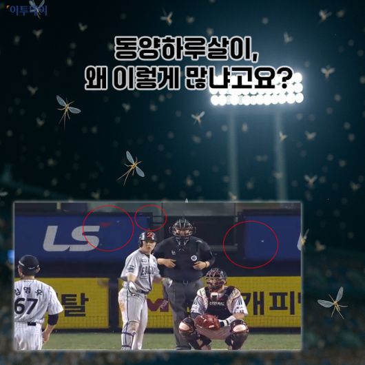 도심으로 들어온 하루살이 떼는 시민들의 일상에 직접적인 불편을 초래합니다. 특히 야간 경기가 열리는 야구장은 매년 주요 피해지역으로 꼽히는데요. 야간경기 조명이 켜지는 순간, 조명이 아니라 모기장이 내려온 것 같은 착각마저 들죠. 치어리더의 율동보다 관중의 부채질이 더 격해지는 때가 오고야 만 건데요. 아니나 다를까 28일 서울 잠실야구장 프로야구 한화이글스와 LG트윈스 경기 중계 화면에서도 이들은 자신의 존재를 뽐냈습니다.