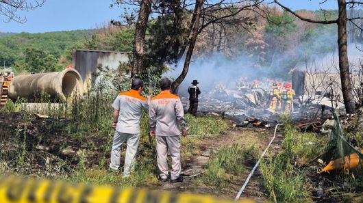 ▲ 29일 오후 경북 포항시 남구 동해면 신정리 한 야산에 해군 초계기가 추락한 가운데 소방 관계자들이 탑승자 수색을 하고 있다.