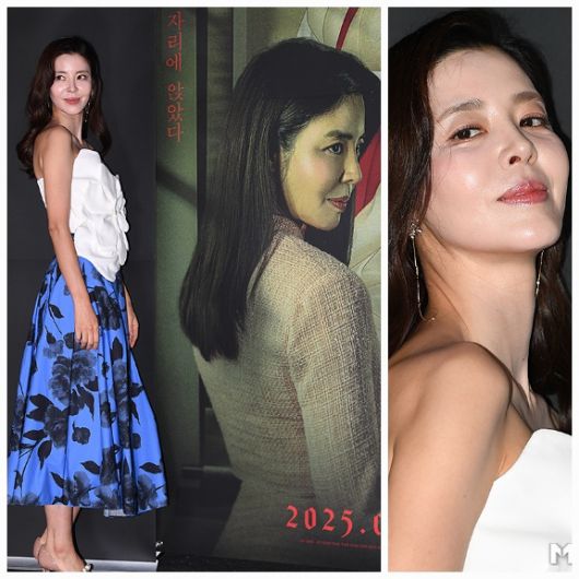 29일 오전 서울 CGV 용산에서 열린 영화 ‘신명’ 제작보고회에 참석한 김규리는, 화려하면서도 고혹적인 비주얼로 시선을 사로잡았다. 이날 그녀는 대형 화이트 플라워 장식이 포인트인 오프숄더 톱에, 블랙 플라워 패턴이 들어간 선명한 블루 풀스커트를 매치하며 무대 위의 조명을 온전히 끌어안았다.