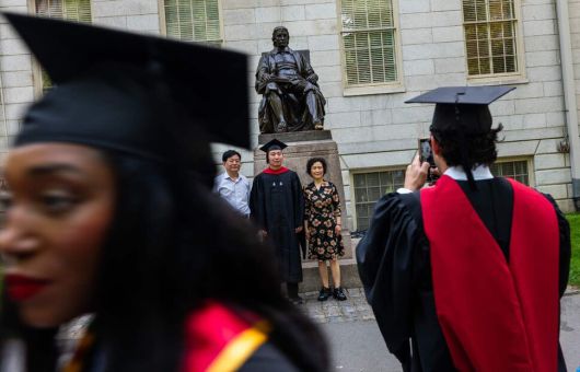28일(현지시각) 미국 매사추세츠주 보스턴 하버드대 캠퍼스에서 학생들이 학사모를 쓰고 가족과 함께 기념사진을 찍고 있다. 보스턴/AFP 연합뉴스 |