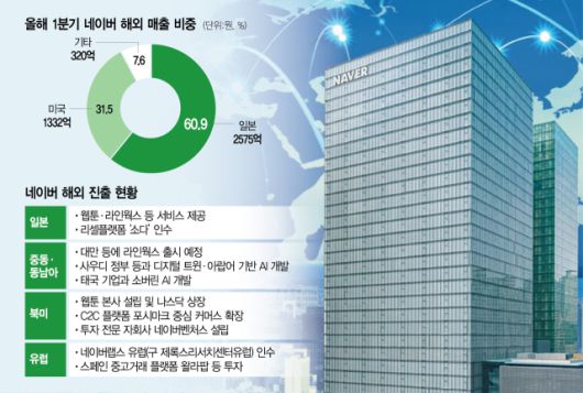 네이버는 신성장 동력 발굴을 위해 해외 시장을 계속 두드리고 있다. 네이버의 올해 1분기 매출(2조 7868억 원) 가운데 해외 비중은 15.2%선에 머물렀다. 이마저도 60.9%를 일본에서 벌어들였다. 해외 시장 다변화가 절실하다. 김소혜 한화투자증권(003530) 연구원은 “글로벌 스토리가 추가되지 못한 상황에서 멀티플(기업가치 평가 배수) 20배 이상을 바라보기엔 부족하다”고 말했다.