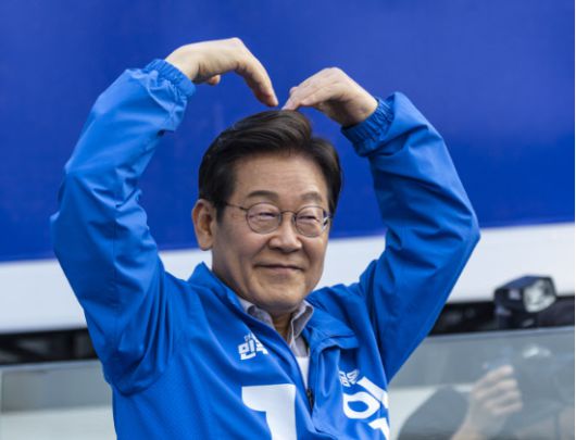 이재명 더불어민주당 대선 후보가 28일 서울 왕십리역 광장에서 열린 성동구·동대문구 집중 유세에서 연설을 마친 뒤 무대를 떠나며 큰 하트를 그려 보이고 있다. (사진=연합뉴스) |