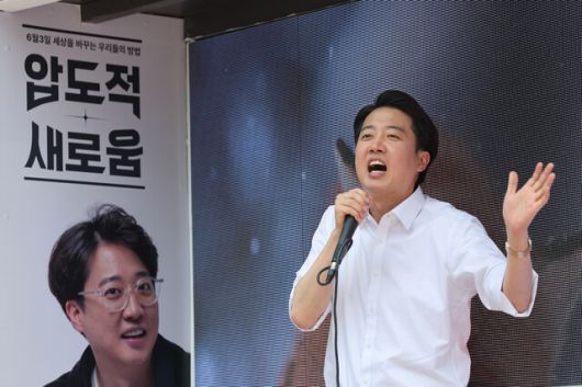 이준석 개혁신당 대통령 후보가 대선 사전투표 첫날인 29일 낮 경기 성남시 분당구 판교테크노벨리에서 지지를 호소하고 있다. 김영원 기자 forever@hani.co.kr |