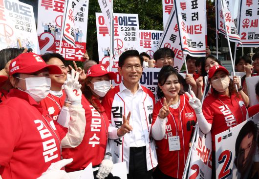 인천에서 제21대 대통령선거 사전투표 첫날인 29일 국민의힘 김문수 대선후보(가운데)가 인천 중구 자유공원에서 유세를 마친 뒤 선거운동원들과 기념촬영을 하고 있다.뉴스1 |