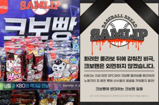서울의 한 편의점에 한국야구위원회(KBO)와 SPC삼립이 협업해 만든 ‘크보빵’(KBO빵)이 진열돼 있는 모습(왼쪽)과 ‘크보빵을 반대하는 크보팬 일동’이 올린 불매운동 게시물. 연합뉴스·엑스(X) 캡처 |