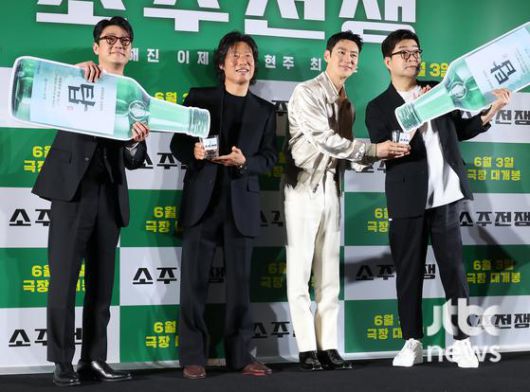 영화 '소주전쟁'이 개봉을 하루 앞둔 29일 오후 서울 용산구 CGV용산아이파크몰에서 언론시사회를 통해 최초 공개 된 가운데, 주연배우 유해진 이제훈 손현주 그리고 바이런 만이 작품에 대한 소개와 자신감을 내비쳤다. 제작사와의 갈등으로 크레딧에서 제외 된 감독의 부재로 영화의 최초 기획 의도나 감독의 연출 방향성 등을 듣지는 못했지만, 작품에 참여한 배우들의 진정성이 빈자리를 빈틈없이 채우며 기대를 더했다.