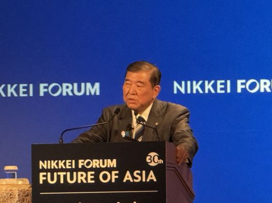 이시바 시게루 일본 총리가 29일 일본 니혼게이자이신문사가 주최하고 중앙일보가 미디어 파트너로 참여한 '아시아의 미래' 콘퍼런스에서 연설을 하고 있다. 김현예 특파원 |