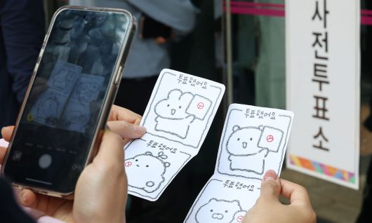 제21대 대통령선거 사전투표 첫날인 29일 서울 강남구 삼성2동주민센터에 마련된 사전투표소 앞에서 시민들이 투표 도장이 찍힌 그림을 들고 기념촬영을 하고 있다. 연합뉴스 |