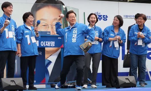 서울에서 더불어민주당 이재명 대선후보(가운데)가 29일 오후 서울 송파구 잠실종합운동장역 앞 유세장에서 기표 기호가 그려진 야구공을 던지는 퍼포먼스를 선보이고 있다. 허정호 선임기자 |