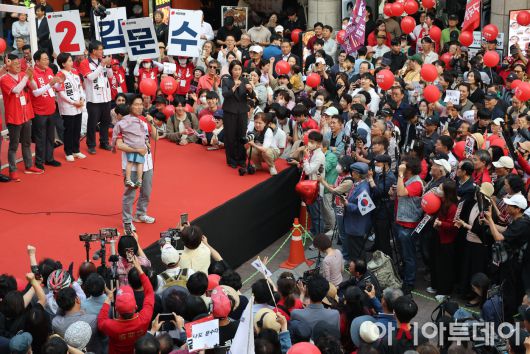 아시아투데이 송의주 기자 = 김문수 국민의힘 대선 후보가 29일 오후 경기도 안양시 “대역전의 서막, 안양” 유세에서 한 어린 아이를 안고 연설을 하고 있다. ⓒ "젊은 파워, 모바일 넘버원 아시아투데이"