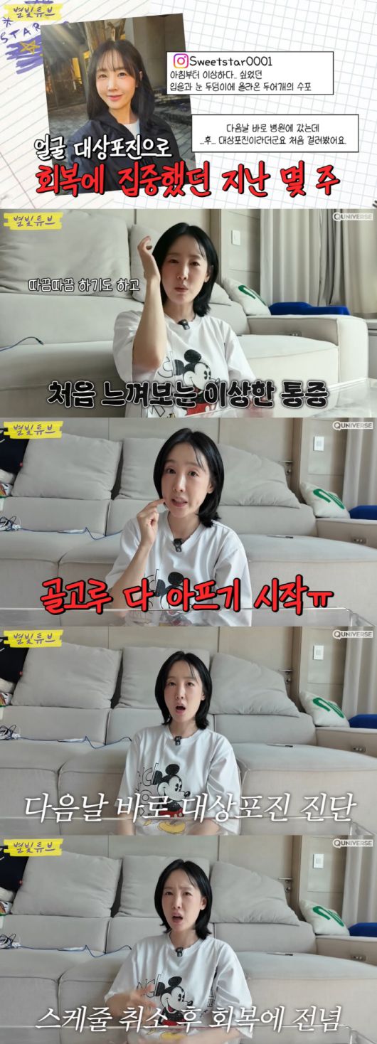 이어 "근데 다다음날 '꼬리에 꼬리를 무는 그날 이야기' 녹화가 있었다. 화요일 녹화였는데 월요일에 대상포진 진단을 받은 거여서 촬영을 취소할 수 없었다. 다행히 '꼬리에 꼬리를 무는 그날 이야기'는 옆모습만 찍어서 멀쩡한 왼쪽 얼굴만 보이게 했다. 그 후 스케줄은 취소한 후 회복에 전념했다"라고 밝혔다.