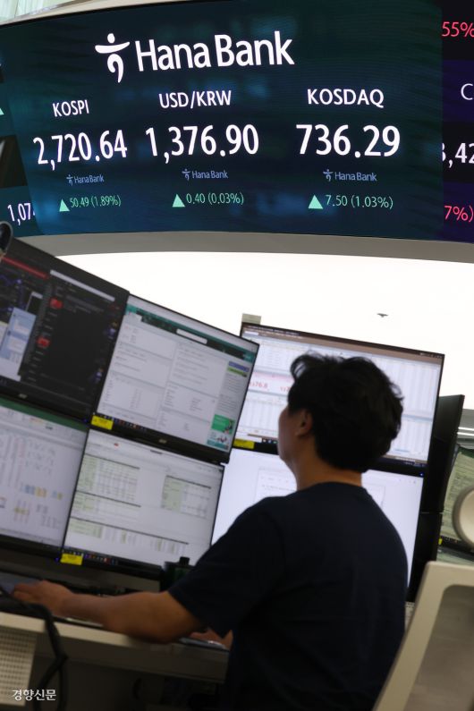 코스피, 10개월 전 수준 회복 지난해 8월 이후 처음으로 장중 코스피지수가 2700을 돌파한 29일 서울 중구 하나은행 딜링룸 전광판에 종가가 표시돼 있다. 이날 코스피지수는 전 거래일 대비 50.49포인트(1.89%) 오른 2720.64로 거래를 마쳤다. 정효진 기자 hoho@kyunghyang.com