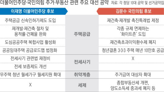 주거 관련 대선 공약으로 더불어민주당·국민의힘 모두 ‘신속한 주택 공급’을 내세웠다. 하지만 양당 모두 대선을 불과 일주일도 남기지 않은 시점에 ‘지각 공약’을 내면서도 구체적 방안이나 목표치는 제시하지 않았다. 무주택자와 세입자의 주거권 관련 공약이 부실하다는 평가도 있다. 특히 논란이 될 수 있는 종합부동산세제 개편, 재건축 초과이익 환수제(재초환) 등과 관련해서는 언급을 회피하고 있다는 지적이 나온다.