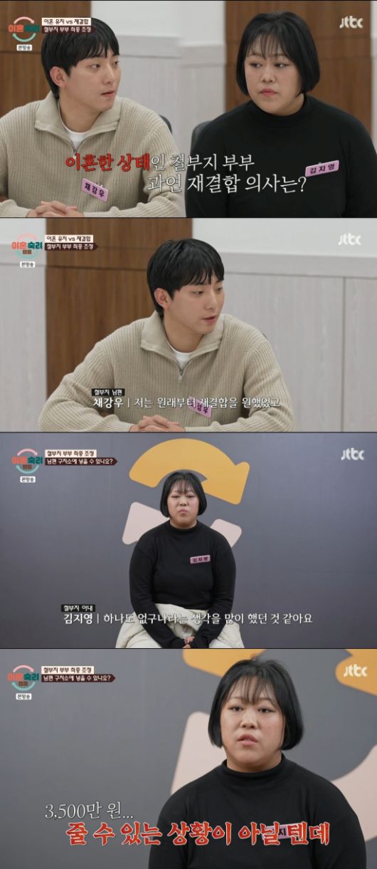 29일 방송된 JTBC '이혼숙려캠프'(이하 '이숙캠')에서는 최초로 이혼한 상태로 재결합을 고려해 출연한 철부지 부부의 최종 조정이 전파를 탔다.