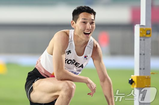 우상혁(용인시청)이 29일 경북 구미시민운동장에서 열린 2025 구미 아시아육상선수권대회 높이뛰기 결선 2m23 1차시기 점프에 성공 후 미소 짓고 있다. 2025.5.29/뉴스1 ⓒ News1 김도우 기자 |