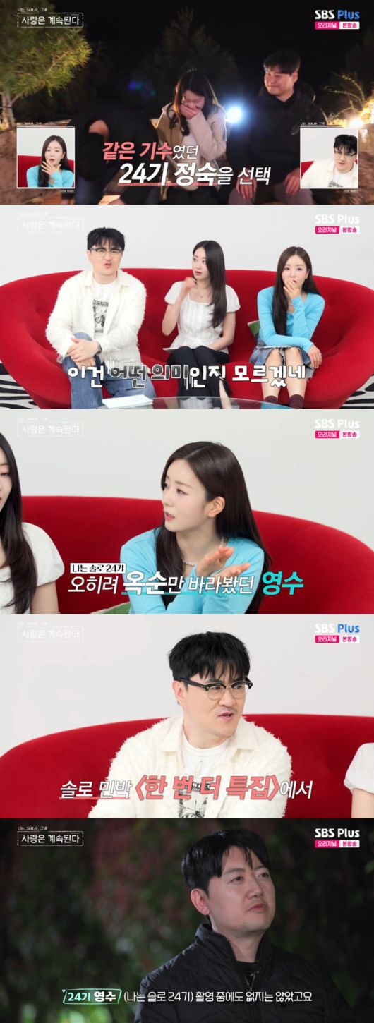 같은 기수 출연진을 뽑은 상황에 데프콘은 "이거는 어떤 의미인지 솔직히 잘 모르겠다"며 깜짝 놀란 모습을 보였고, 윤보미는 "'나솔' 안에는 옥순 님만 바라봤다. 사실 정숙 님과 대화를 많이 안 해봐서 알아보고 싶었을 수도 있다"며 24기 영수의 마음을 분석했다.