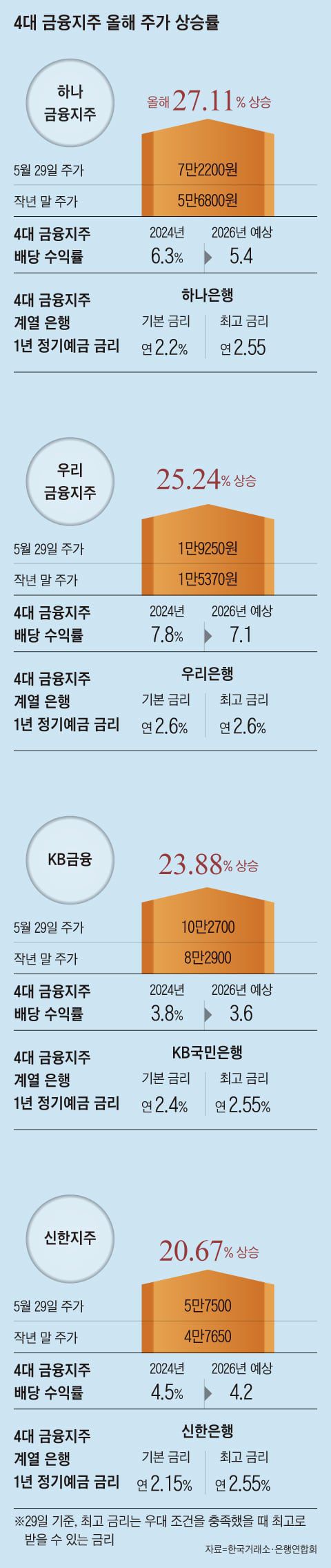 금융지주 배당수익률은 정기예금 금리를 웃돌고 있다. 이에 박씨처럼 정기예금 대신 금융지주 주식을 사는 게 낫다는 얘기도 나온다. 배당 수익에 더해 주가 상승 이익까지 노릴 수 있기 때문이다. 은행연합회에 따르면 29일 기준 KB국민·신한·하나·우리은행 등 4대 금융지주 계열 은행의 1년 만기 정기예금 금리는 우대 조건을 모두 충족해도 연 2.55~2.6% 수준에 머물고 있다. 반면 하나증권이 추정한 4대 금융지주의 올해 예상 배당수익률은 3.6~6.5%로 정기예금 금리 대비 1~3%포인트가량 높다. 작년 초만 해도 연 3%대 후반이던 은행 정기예금 금리가 최근 하락하면서 정기예금은 감소세다. 4대 은행의 정기예금 잔액은 지난 2월 744조3180억원에서 3월 말 730조9164억원, 4월 말에는 729조4952억원으로 줄었다.
