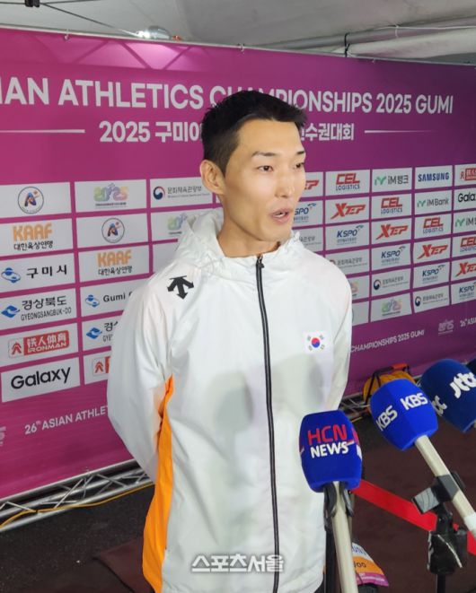 높이뛰기 간판 우상혁이 29일 경북 구미시민운동장에서 열린 2025 아시아육상경기선수권 남자 높이뛰기 결선에서 2m29를 뛰어넘어 우승한 뒤 취재진과 인터뷰하고 있다. 사진 | 구미=김용일 기자 |