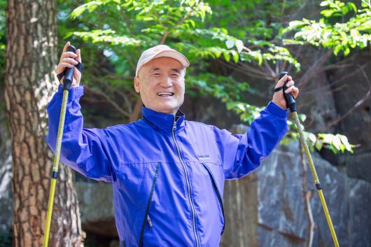 29일 권준하 익산화물터미널 대표가 등산스틱을 쥐고 환하게 웃고 있다. 권 대표는 서울대 경영학과·경제학부 학생들을 위해 ‘등산 장학금’을 만들었다. 6개월간 7번 이상 등산하면 100만원을 준다./조인원 기자 |