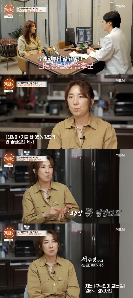 이날 서주경은 다낭성 신장 증후군을 30년째 앓고 있다고 고백하며 “제가 3기다. 4기로 넘어가는 건 알 수가 없다. 지금 신장이 85%가 안 좋을 거다”라고 전했다.