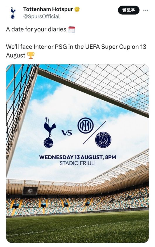 토트넘은 30일 구단 누리소통망(SNS)에 "오는 8월 13일 오후 8시, 우리는 인터 밀란 또는 파리 생제르맹(PSG)과 UEFA 슈퍼컵을 치른다"며 경기일과 경기 장소인 이탈리아 우디네의 스타디오 프리울리가 적힌 포스터를 띄웠다.