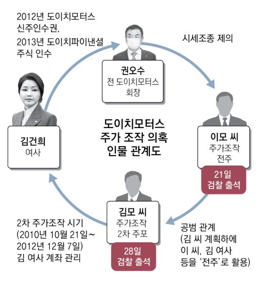 서울고검 형사부(부장검사 차순길)는 28일 오후 주포 김모 씨를 참고인 신분으로 불러 4시간 반 동안 조사했다. 김 씨는 2차 주가조작 시기인 2010년 10월부터 2012년 12월 사이 김 여사 계좌를 관리하며 시세 조종에 가담한 혐의로 징역 2년에 집행유예 3년의 확정 판결을 받았다. 검찰은 27일 블랙펄인베스트 임원 출신인 민모 씨도 불러 조사했다. 민 씨는 김 여사의 주식 거래 내역을 엑셀 파일로 따로 정리해 둔 인물로도 알려져 있다.